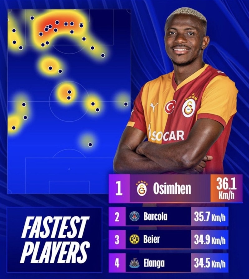 Buna göre Osimhen, Şampiyonlar Ligi son 16 play-off turu haftasında 36.1 km hız ile ‘en hızlı oyuncu’ seçildi.