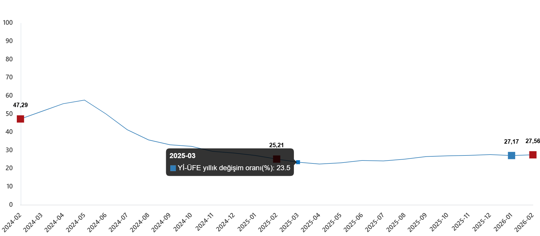 Yİ-ÜFE (2003=100) 2026 yılı Şubat ayında bir önceki aya göre %2,43 artış, bir önceki yılın Aralık ayına göre %5,16 artış, bir önceki yılın aynı ayına göre %27,56 artış ve on iki aylık ortalamalara göre %25,60 artış gösterdi.