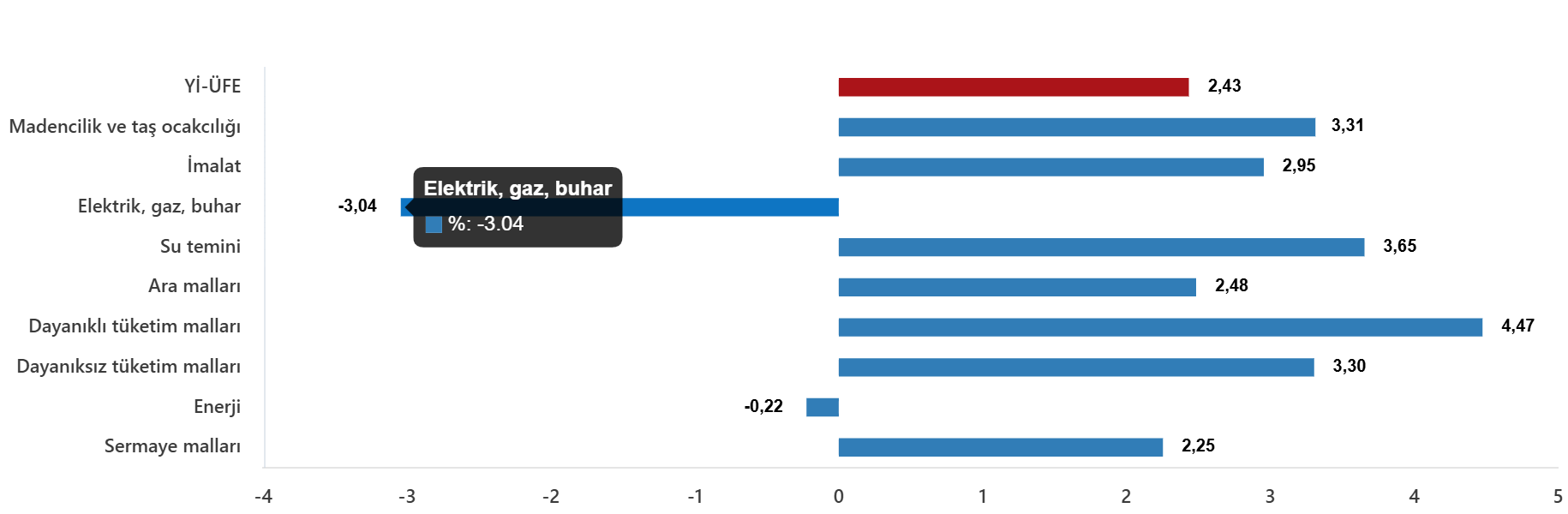 Sanayinin dört sektörünün aylık değişimleri; madencilik ve taş ocakçılığında %3,31 artış, imalatta %2,95 artış, elektrik, gaz üretimi ve dağıtımında %3,04 azalış ve su temininde %3,65 artış olarak gerçekleşti.