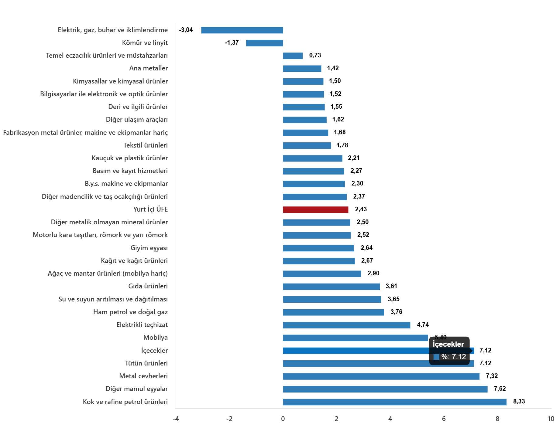 Ana sanayi gruplarının yıllık değişimleri; ara mallarında %26,09 artış, dayanıklı tüketim mallarında %32,14 artış, dayanıksız tüketim mallarında %31,57 artış, enerjide %20,68 artış ve sermaye mallarında %29,51 artış olarak gerçekleşti.