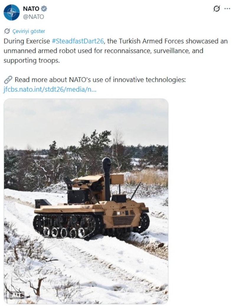 NATO’nun resmi sosyal medya hesabından yapılan paylaşımda ise Türk Silahlı Kuvvetleri’nin tatbikat sırasında keşif, gözetleme ve birliklere destek amacıyla kullanılan insansız silahlı robotu sergilediği ifadelerine yer verildi.