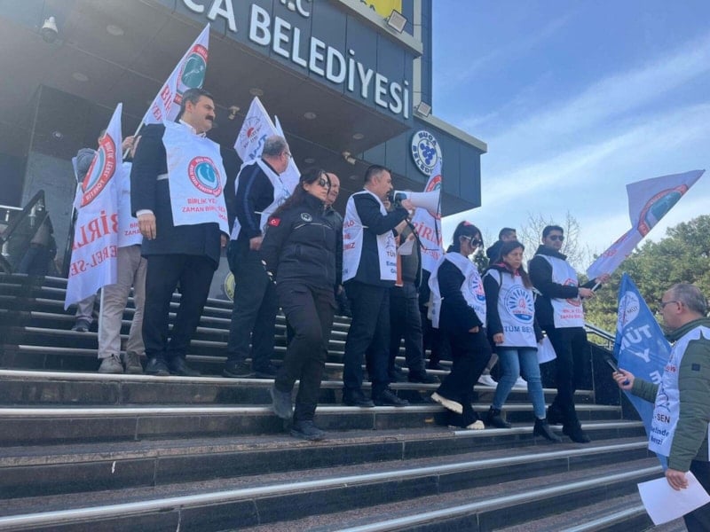 Tüm Bel-Sen İzmir 2 No’lu Şube, Tüm Yerel Sen İzmir 2 No’lu Şube ve Birlik Yerel-Sen’e bağlı memurlar bina önünde bir araya gelerek slogan attı.