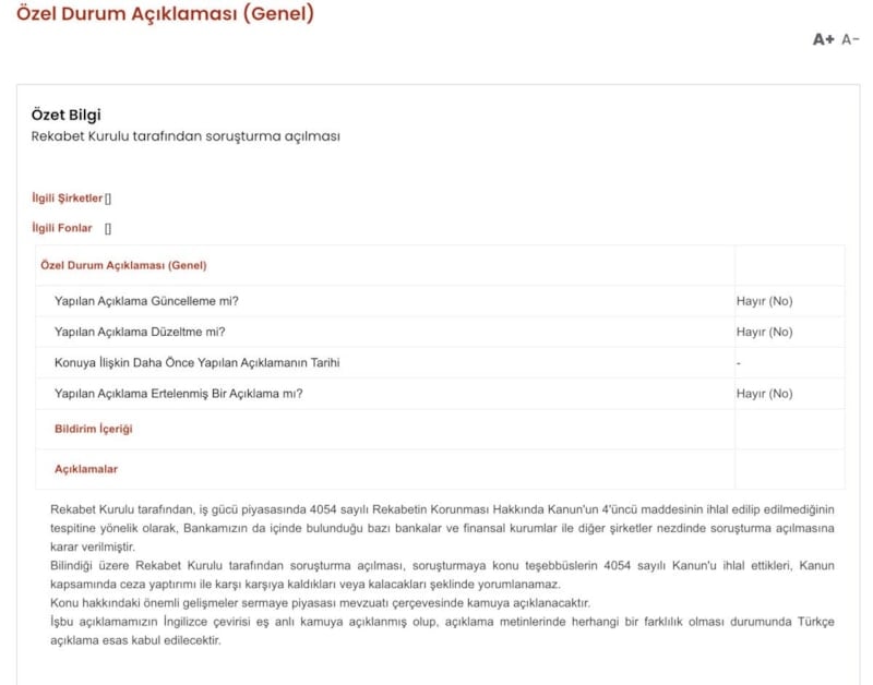 Yapı Kredi, Rekabet Kurulu’nun iş gücü piyasasında rekabetin korunması kapsamında bazı bankalar hakkında soruşturma açtığını açıkladı.