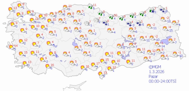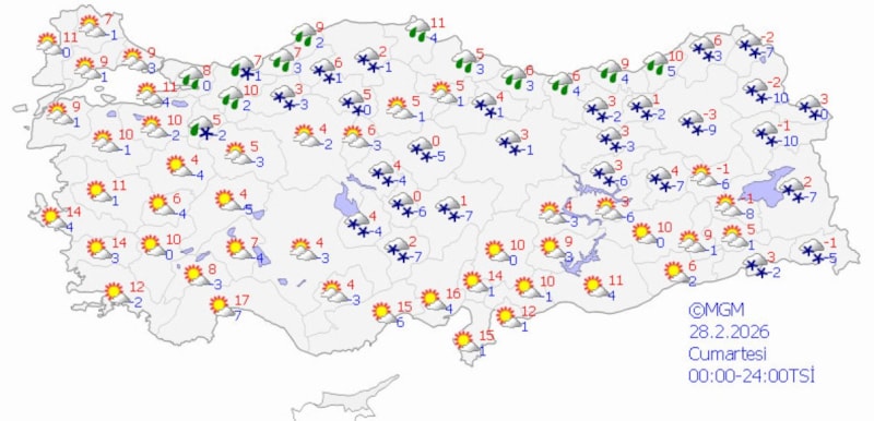 Doğu ve iç kesimlerde karın, batıda ise bulutlu havanın hakim olacağı öngörülüyor.