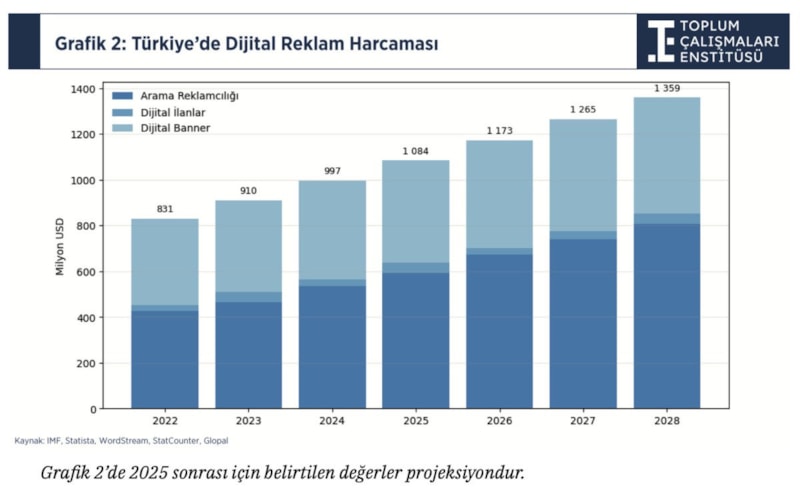 Enstitünün raporunda yer alan grafiklerde, büyümenin özellikle arama reklamcılığı segmentinde yoğunlaştığına dikkat çekildi. Tüketicinin internette bir arama sorgusu girdiğinde önüne çıkan reklamlar için yapılan işletmelerce yapılan harcamaların, yani arama reklamcılığı harcamalarının 2022’de yaklaşık 430 milyon dolar düzeyindeyken 2025’te 600 milyon dolar bandını aştığı, 2028 projeksiyonunda ise 800 milyon dolara yaklaşacağı aktarıldı.