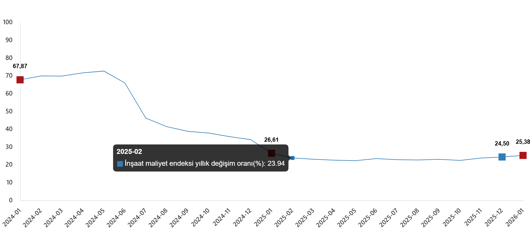 İnşaat maliyet endeksi, 2026 yılı Ocak ayında bir önceki aya göre %9,87 arttı, bir önceki yılın aynı ayına göre %25,38 arttı. Bir önceki aya göre malzeme endeksi %3,52 arttı, işçilik endeksi %21,84 arttı. Ayrıca bir önceki yılın aynı ayına göre malzeme endeksi %23,32 arttı, işçilik endeksi %28,83 arttı.