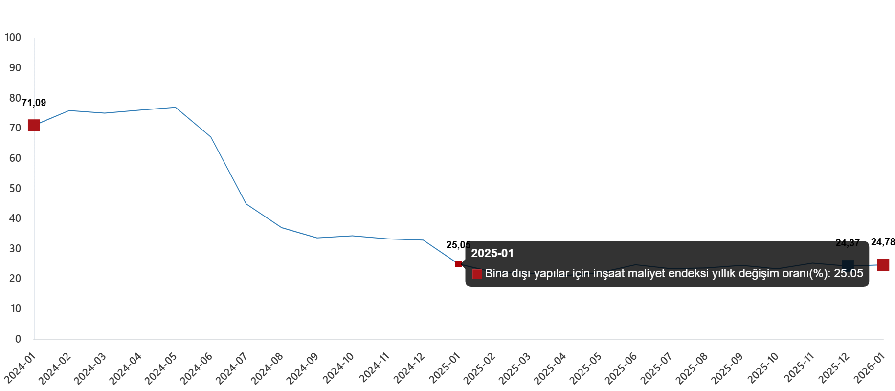 Bina dışı yapılar için inşaat maliyet endeksi yıllık değişim oranı(%), Ocak 2026