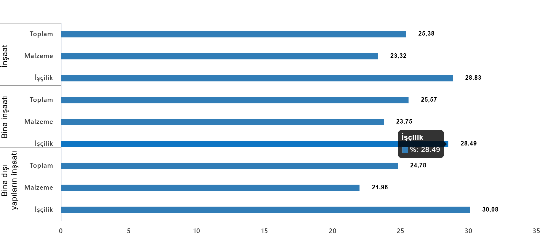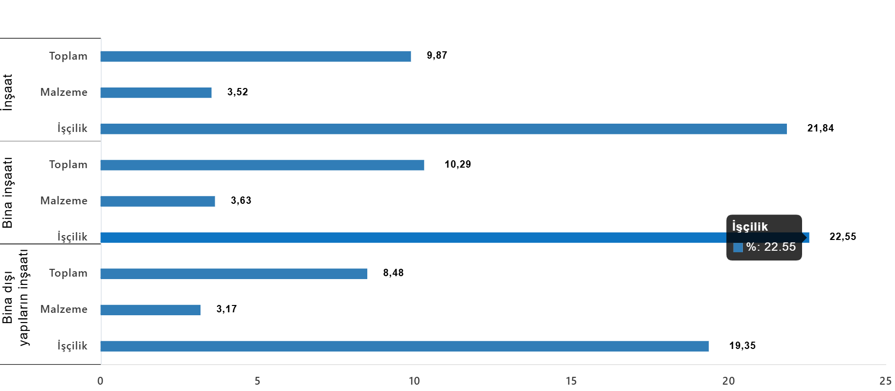 Bina inşaatı maliyet endeksi, bir önceki aya göre %10,29 arttı, bir önceki yılın aynı ayına göre %25,57 arttı. Bir önceki aya göre malzeme endeksi %3,63 arttı, işçilik endeksi %22,55 arttı. Ayrıca bir önceki yılın aynı ayına göre malzeme endeksi %23,75 arttı, işçilik endeksi %28,49 arttı.