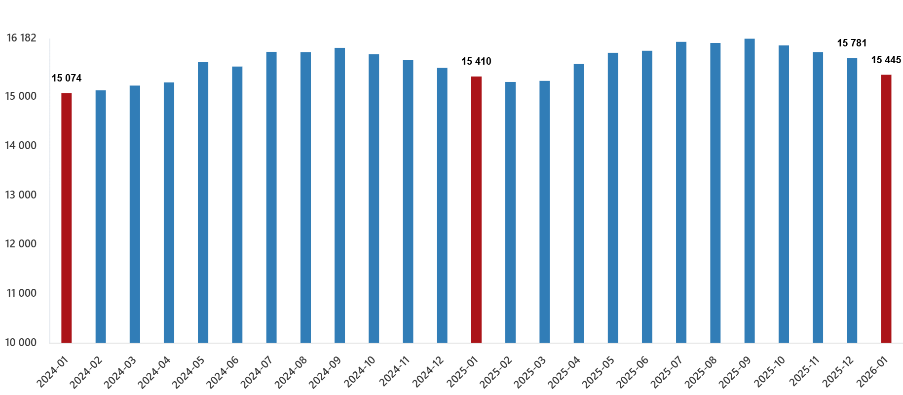 Sanayi, inşaat ve ticaret-hizmet sektörleri toplamında ücretli çalışan sayısı 2026 Ocak ayında bir önceki yılın aynı ayına göre %0,2 arttı. Ücretli çalışan sayısı bir önceki yılın aynı ayında 15 milyon 410 bin 257 kişi iken, 2026 yılı Ocak ayında 15 milyon 444 bin 683 kişi oldu.