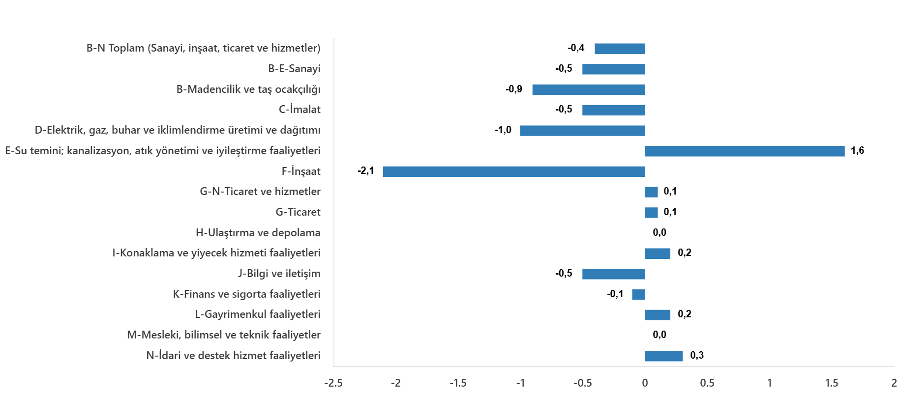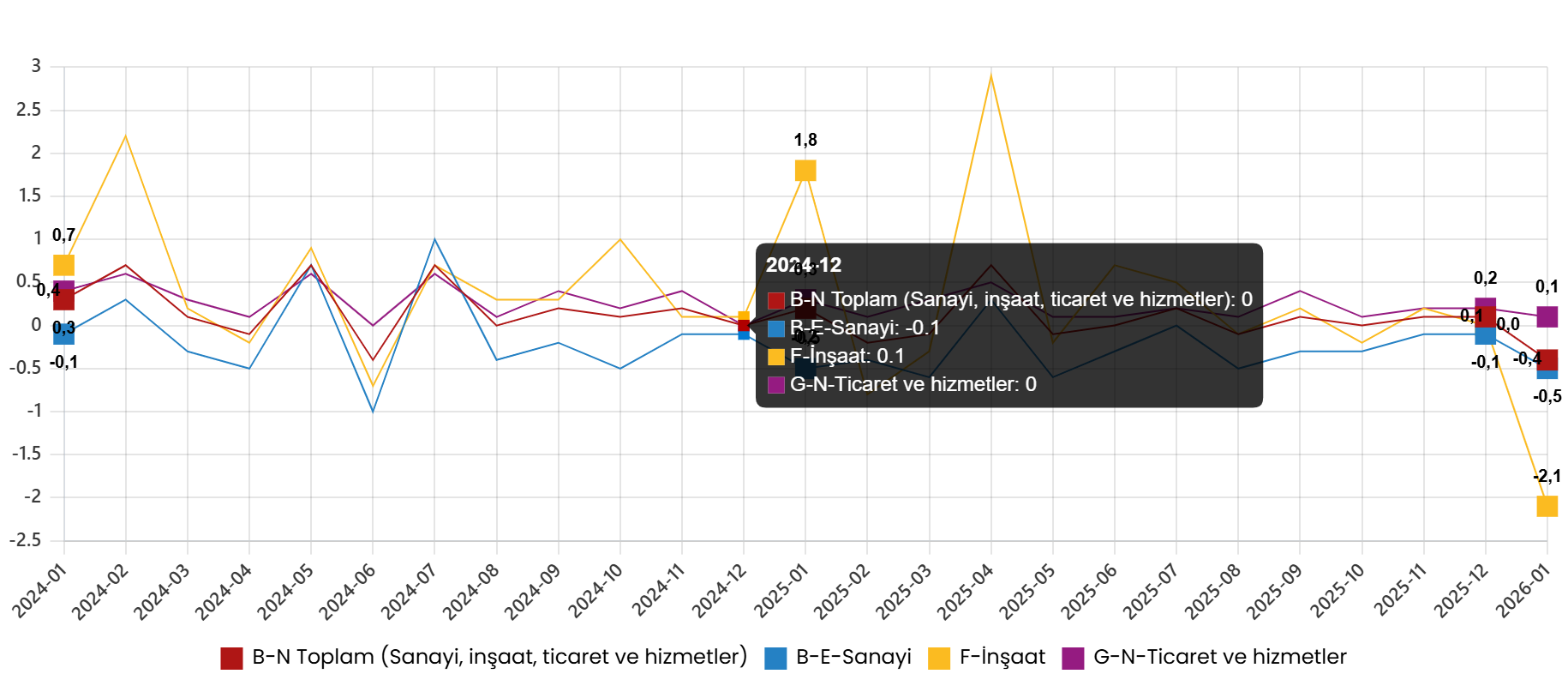 Ücretli çalışanların alt detaylarına bakıldığında; 2026 Ocak ayında ücretli çalışanlar aylık olarak sanayi sektöründe %0,5 azaldı, inşaat sektöründe %2,1 azaldı ve ticaret-hizmet sektöründe %0,1 arttı.